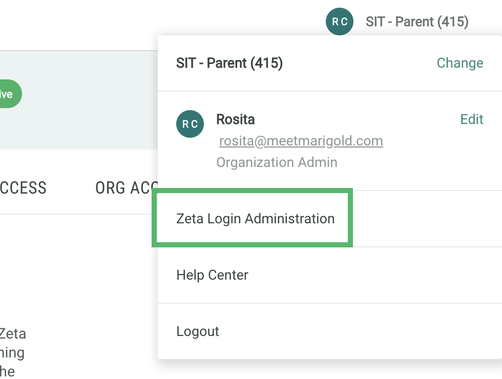 Business Unit Administrators and Organization Administrators have access to a separate Zeta Login Administration environment that is accessible from within the User Workspace portal.