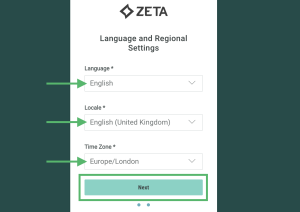 Select your preferred language, and your location and time zone.