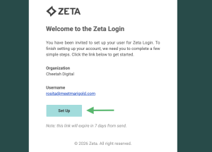 In the Welcome Email message, click Set Up. The Welcome to the Zeta Login pop-up window is displayed.