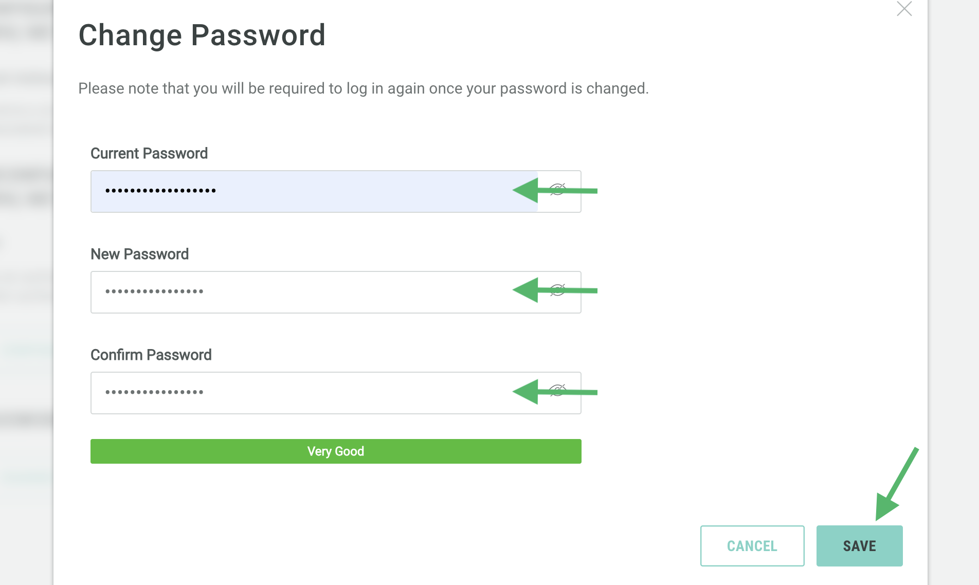 Enter and confirm a new password. Passwords must be at least 12 characters long, and meet the strength requirements of the password check.