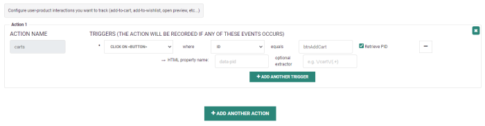 Triggers — This defines which consumer interaction will lead to a cart addition: you can choose from a click on a button, in a DIV, or a form submission event. You can add as many triggers as required for one action and when one if these triggers fires, the action is considered as executed and will be saved.
