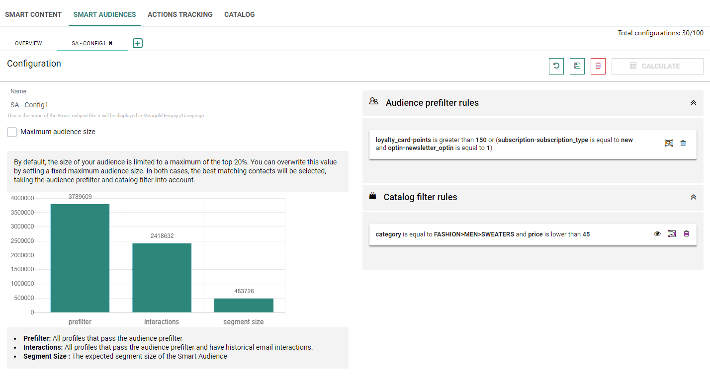segment size — The final calculated Smart Audience segment combining the audience prefilter rules with the interactions, for which scores are calculated and based on the contacts' interests in the products/items from the catalog filters (catalog filter rules).