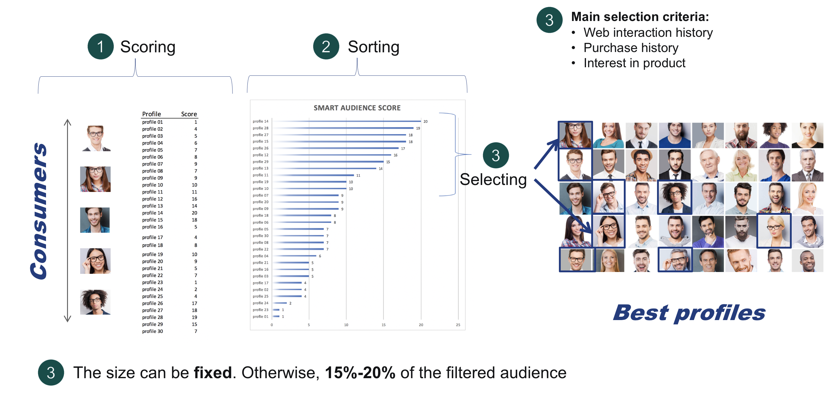 - For both the 20% default size and the fixed specified size, the contacts are sorted according to a score. The top contacts (best profiles to interact with your brand) are used to fill the Smart Audience.