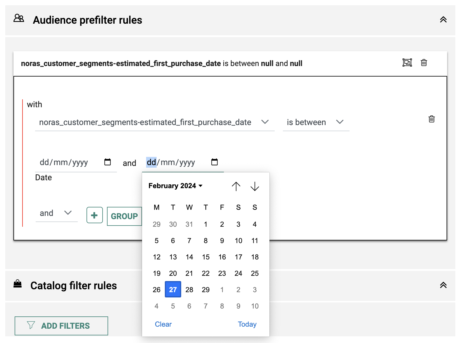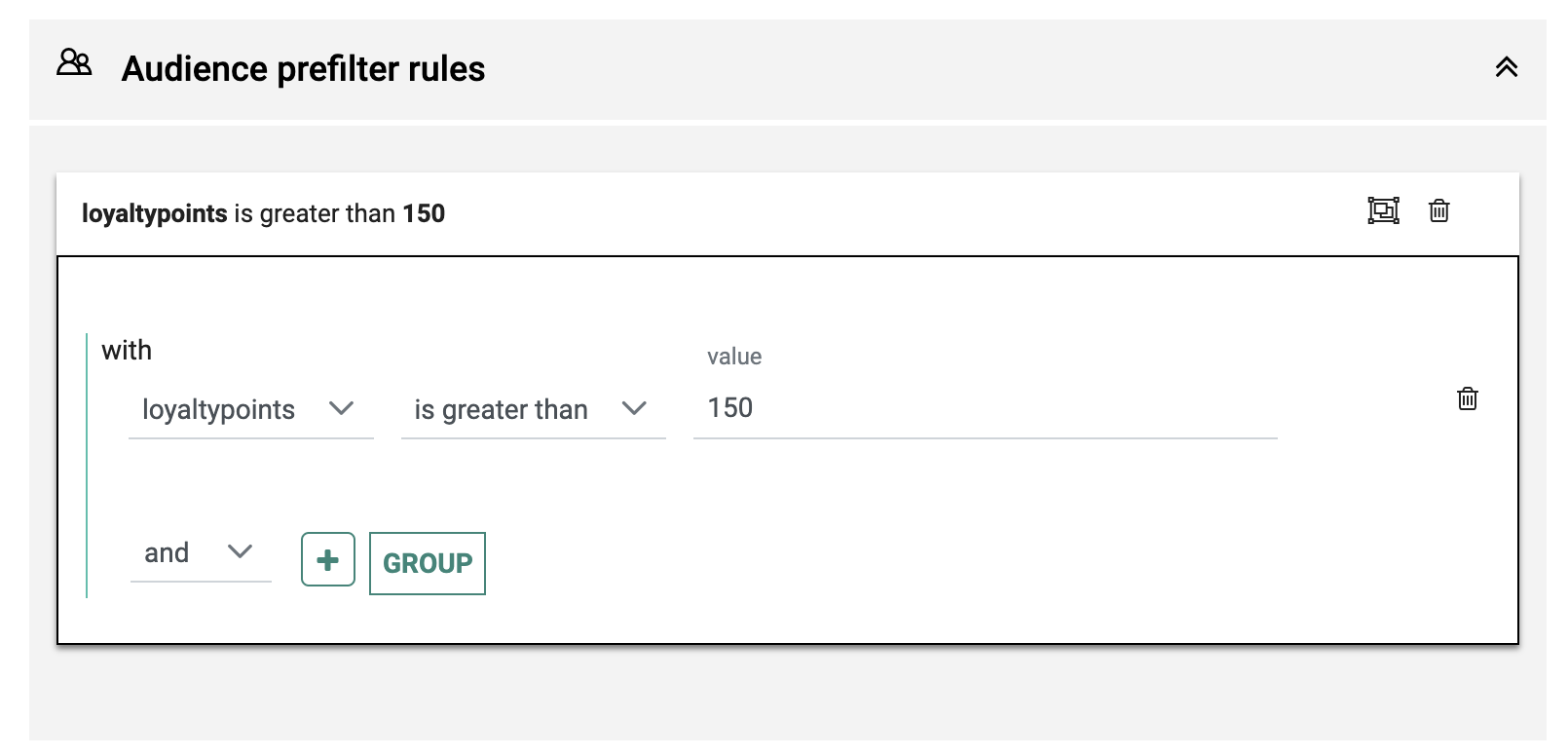 — Delete. This can be applied to a single filter rule, or on the combination of all rules (which is the audience prefilter or the catalog filter as a whole). -