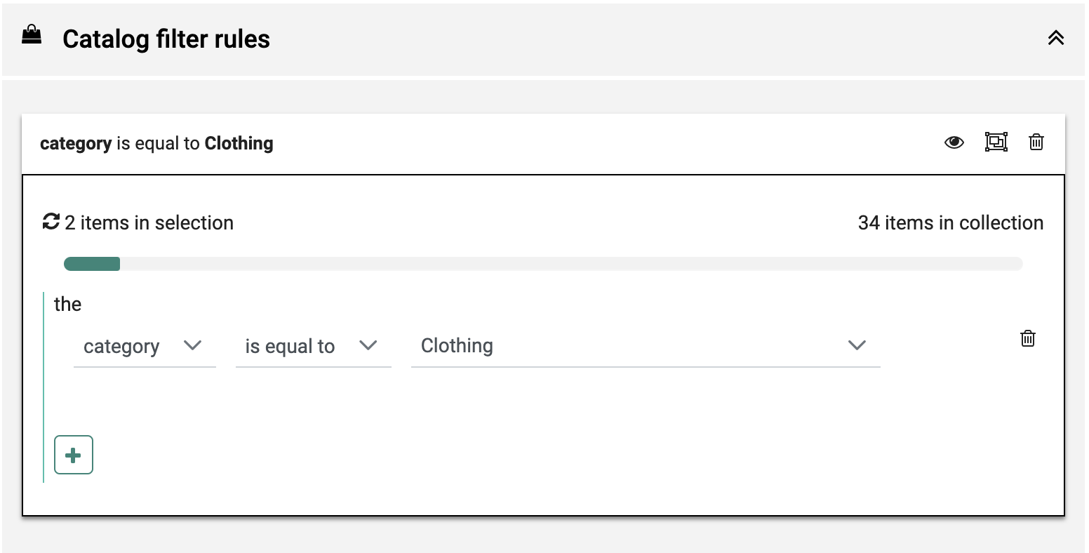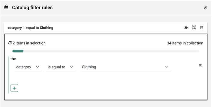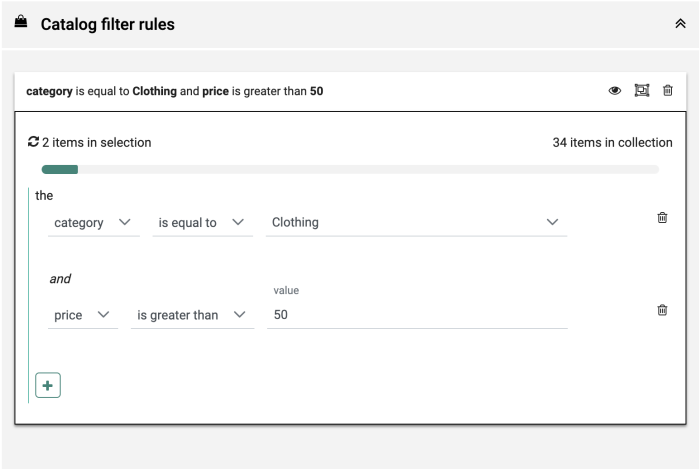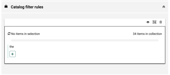 Note that this needs to be done each time you make a change to the catalog filter. When combining multiple catalog filter rules, the 'and' operator is used.