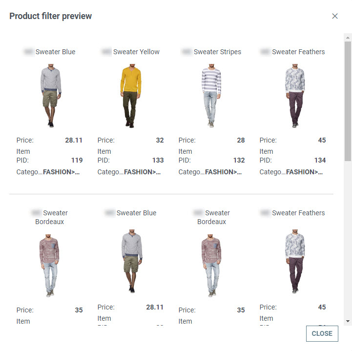 Preview of the catalog filter rules : The category is equal to 'Fashion > Men > Sweaters' and the price is lower than 45.