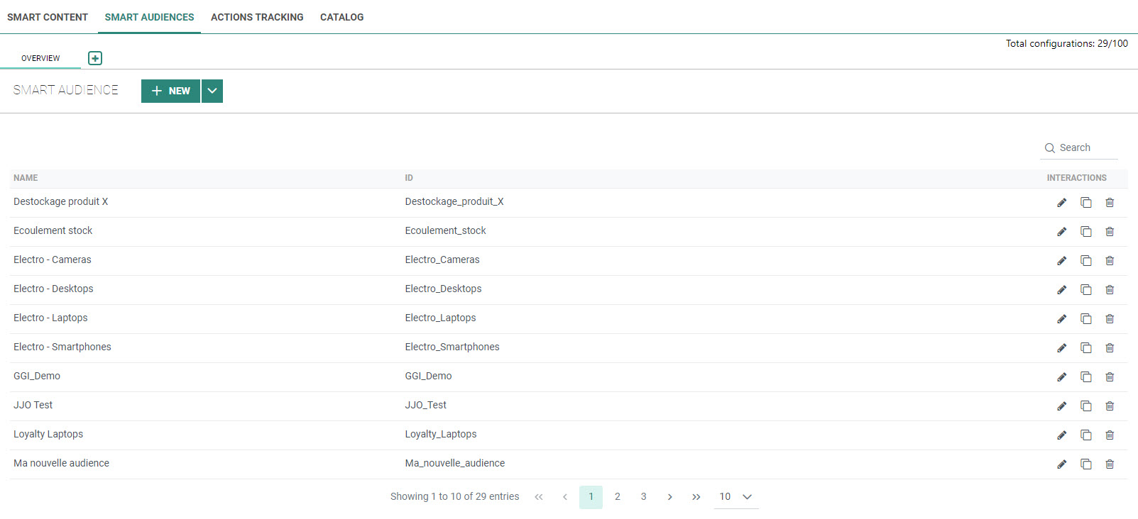 - edit / copy / delete existing Smart Audience configurations using the interaction icons on the right of each configuration