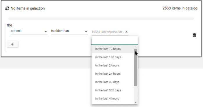 - When using 'is older than' or 'is newer than', a drop-down appears that gives the user options such as 'in the last 2 hours, in the last 30 days, etc.![]()