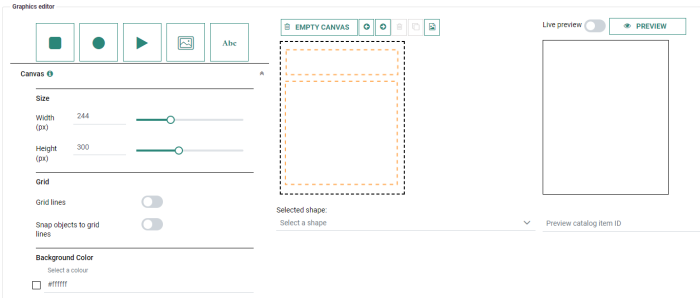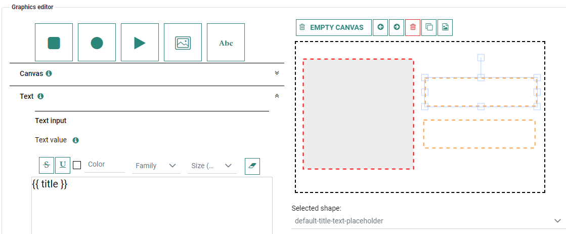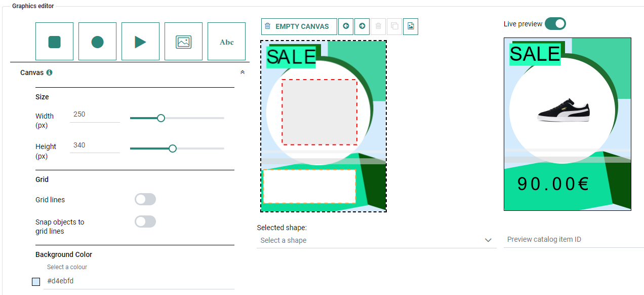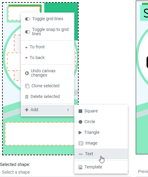 You can add objects to the canvas, such as square, circle and triangle shapes, catalog and local images, and static and catalog texts.