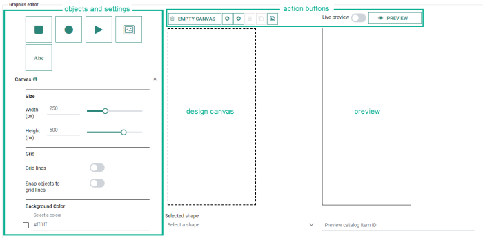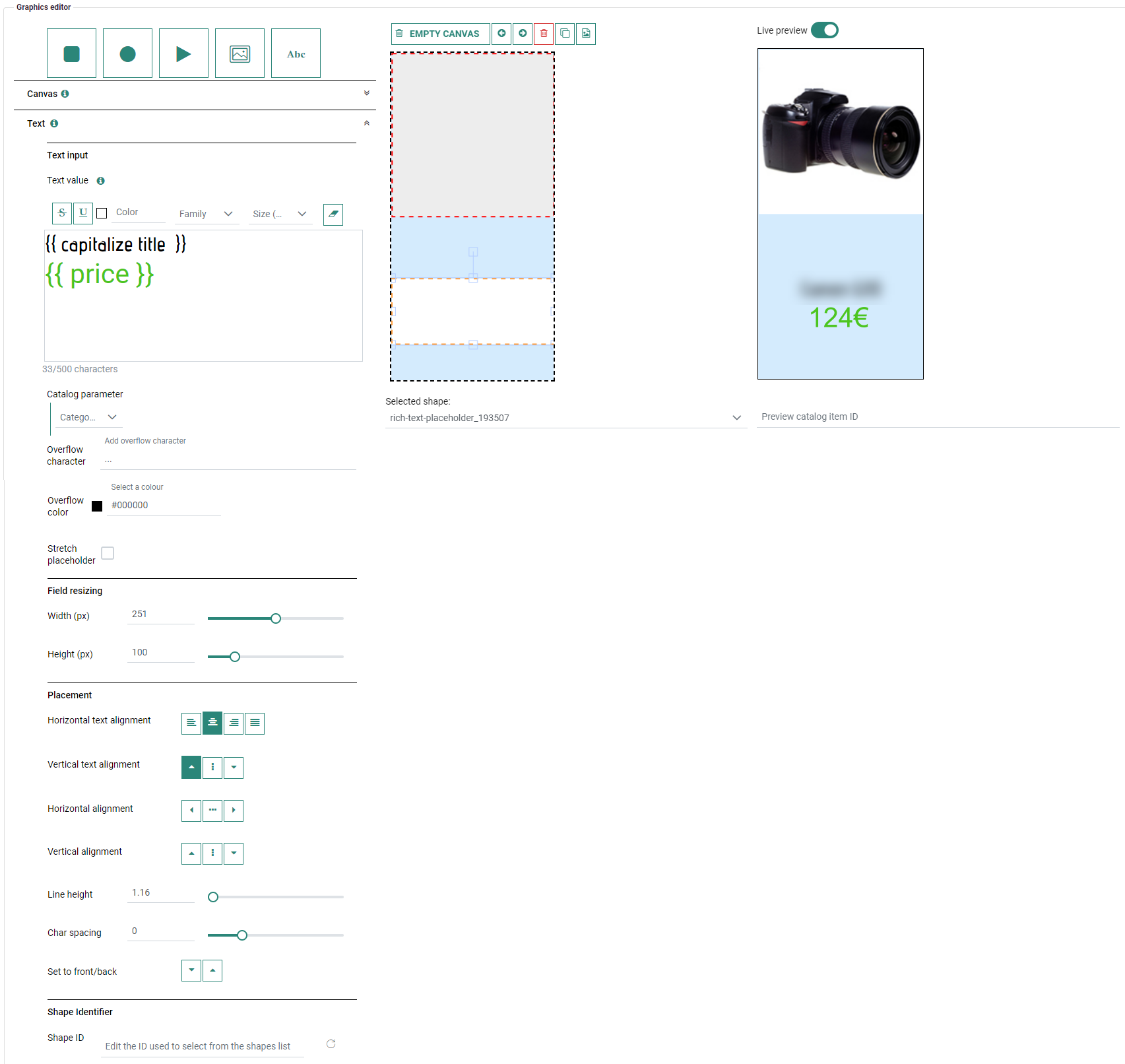 - For the 'catalog image' object : Properties can be set for resizing, placement and shape identifier.