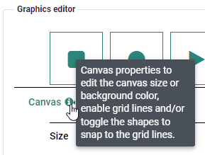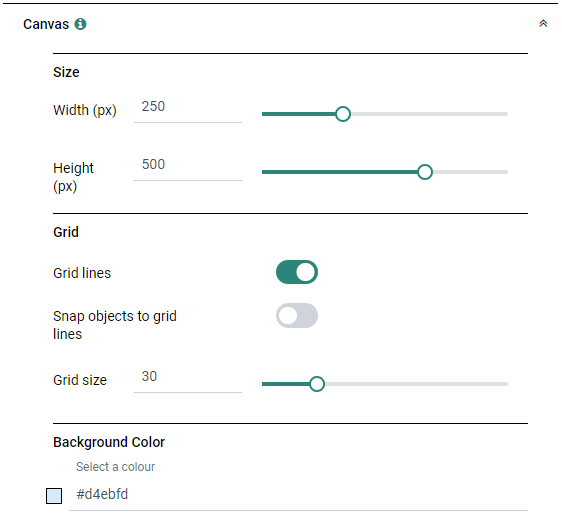 Define the Canvas properties for the width and height of your canvas (in pixels), show grid lines (and choose your preferred grid size) to easily align your objects and optionally snap them to the grid, and edit the canvas background color through a visual color selector or by entering an RGB or HEX color code.