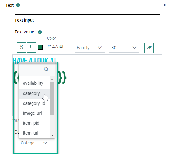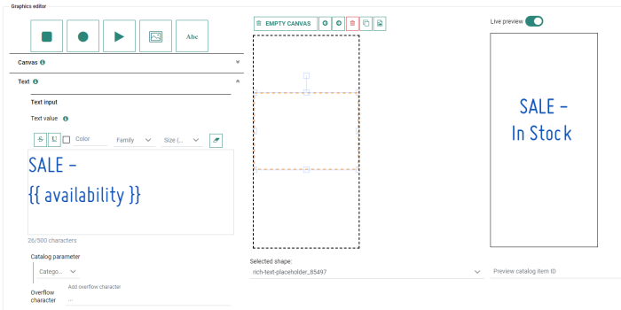 Example of a text value with combined static text "SALE -" and a catalog parameter "{{ availability }}" :