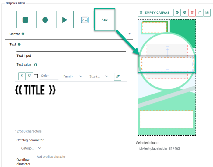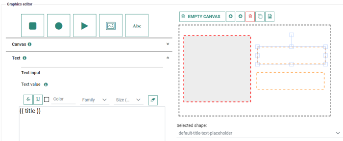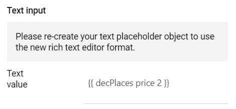 (1) Note: The initial version of the Email Graphics Editor had a simple text editor. Because there's a rich text editor now, previously created text-placeholders now notify you to re-create them, so they're usable as rich text in the updated text editor.
