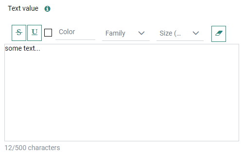 - Static text — After selecting the Text object, the Text input settings are shown. Text can be added in the rich text editor(1) and styling can be applied.