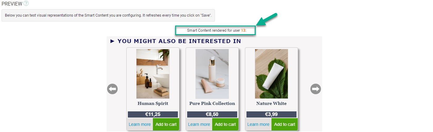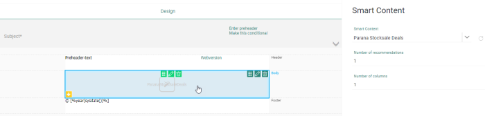 - Smart Content id — The Smart Content id identifies which email Smart Content should generate the product selection to be displayed in the email. You can configure as many email Smart Content setups as you like, and also use as many email Smart Content blocks as you like within a single email.