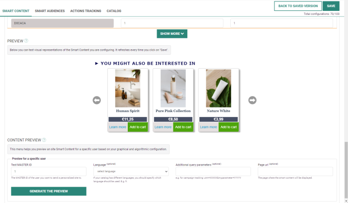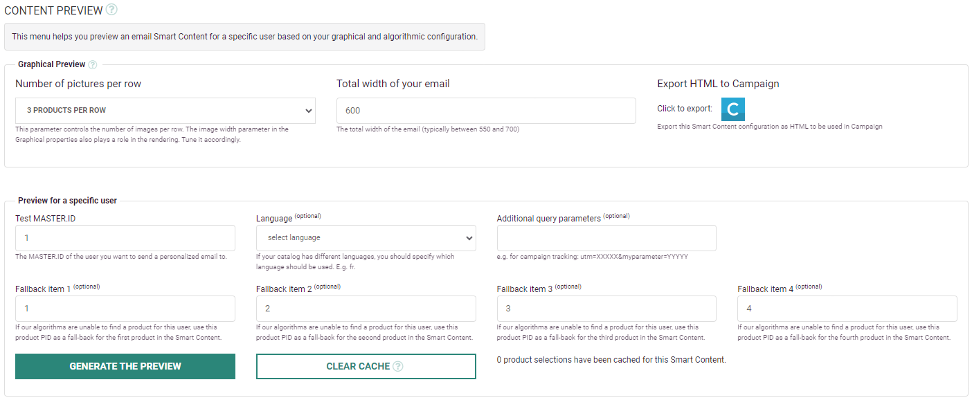 Click on the 'Generate the preview' button to see the content preview for the Selligent/Campaign user corresponding to the Master ID (and other defined settings).
