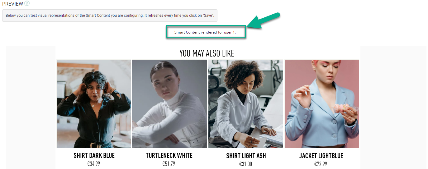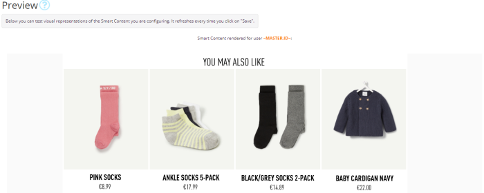 When the email Smart Content is newly created and has not yet been used to generate product selections, you will see this in the "Smart Content content preview" part of the dashboard. Once the Smart Content has been used to generate product selections - either because you sent out a campaign, or because you generated previews - something like this will be displayed :