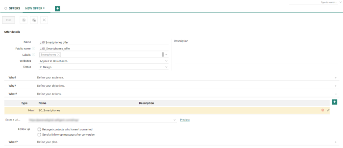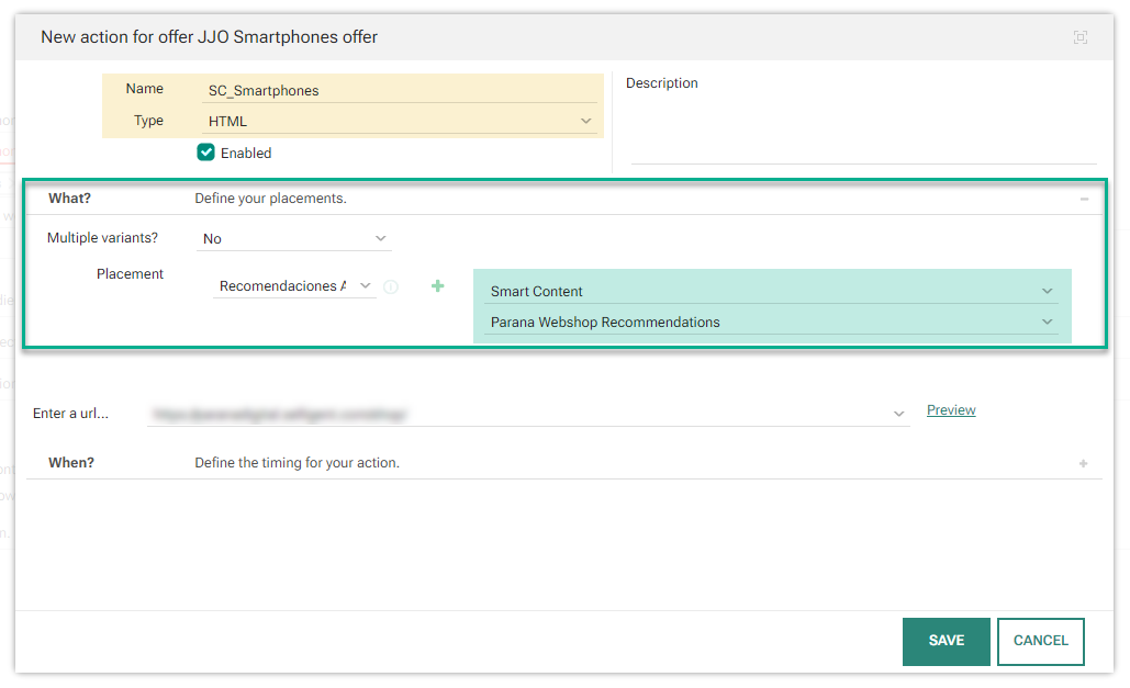 The list of available Smart Content configurations will automatically appear on your offer configuration page. In the "What?" section, select the "Smart Content" type, and the Smart Content you pre-configured in your Recommendations module.