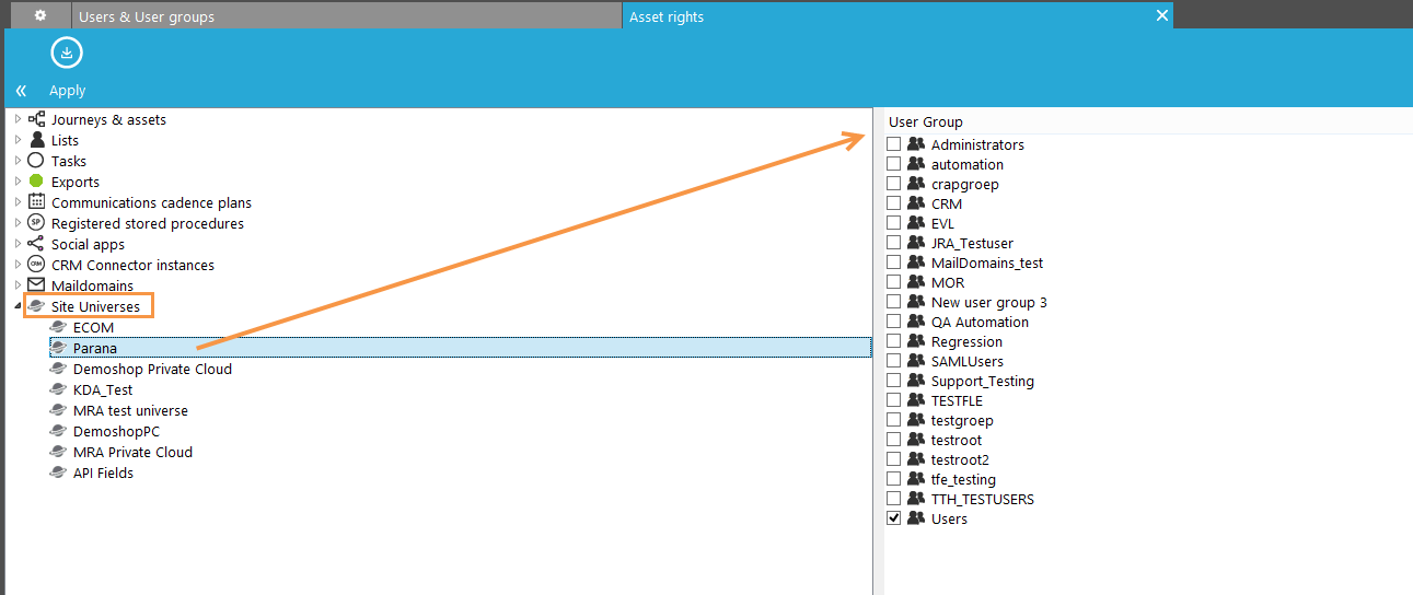 Now, you have to allow the Campaign developers to create journeys for a specific Siteuniverse. You can do this in Campaign, under ‘Settings, asset rights’ by giving them access to the Site universe(s). All universes that have a connection to Campaign are listed here.