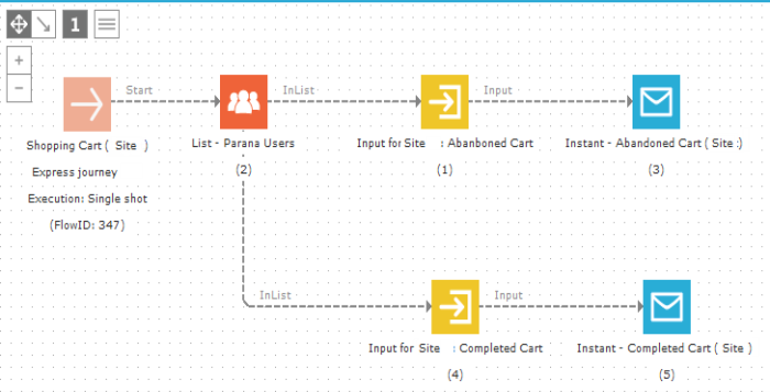 Site contacts can be retargeted with emails or through other channels as a result of the contact's interaction with the cart. Profiles that have abandoned their cart or the opposite, completed the cart and finished the purchase, can be retargeted through Campaign journeys.