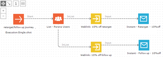 Following is an example of a Journey with two emails. Make sure you set both emails to ‘instant’. Site will trigger these mails, so leave the scheduling to ‘single shot’, you do not need to activate the Journey.