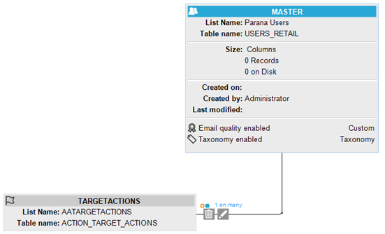 Link the action list 1:N to the Audience list that is used in Site (see also “Universe settings,Connect to Campaign”. In this example with scope name TARGETACTIONS)