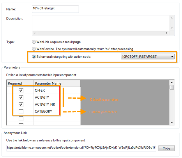 To do so, go to the properties of the Input component. Select type “Behavioral retargeting with action code” and from the drop down select the action code (e.g. “10PCTOFF_RETARGET”).