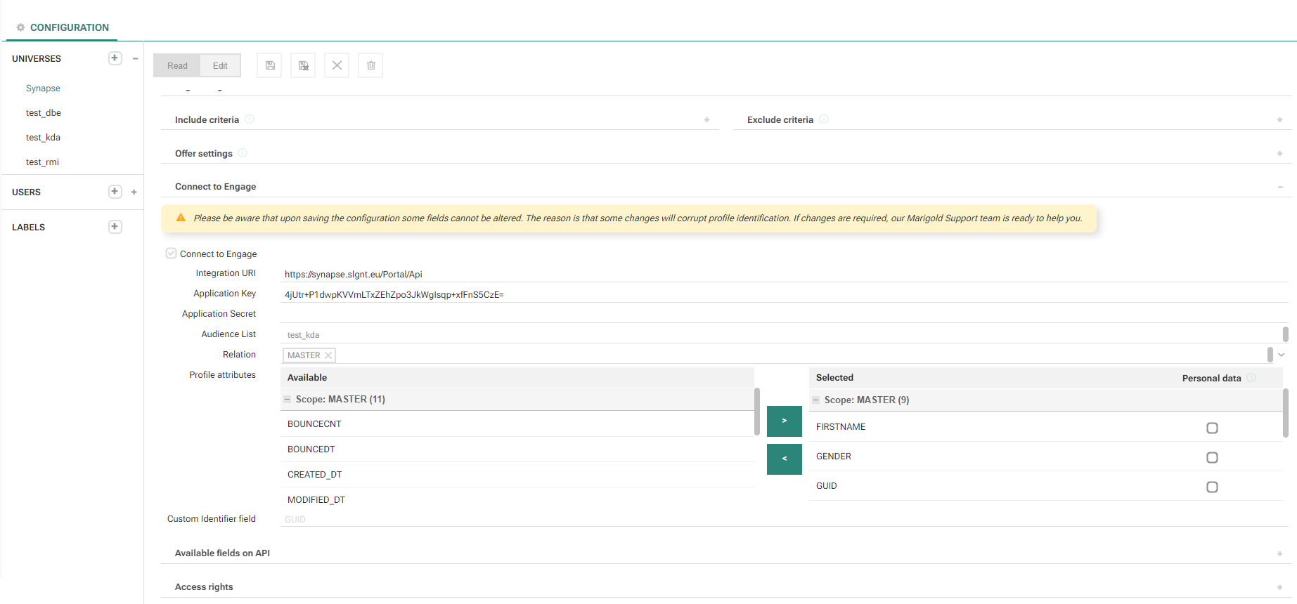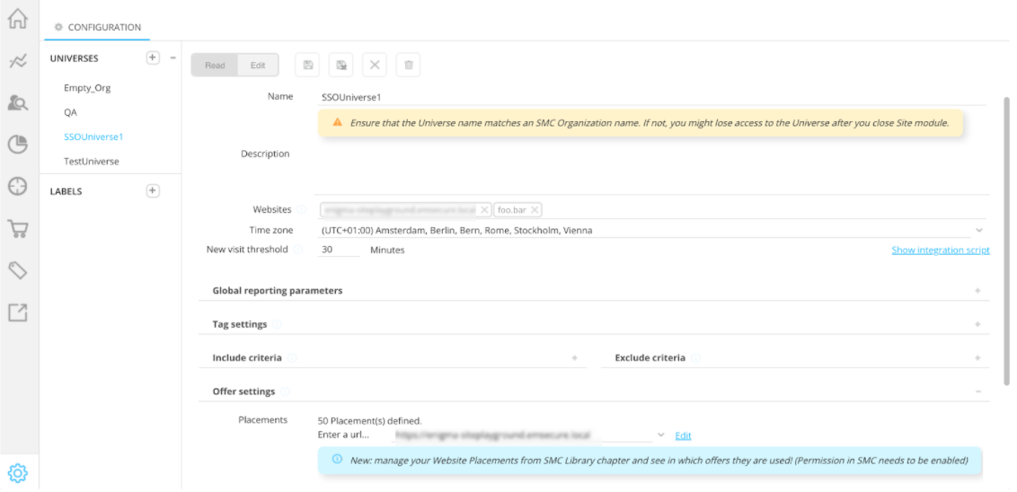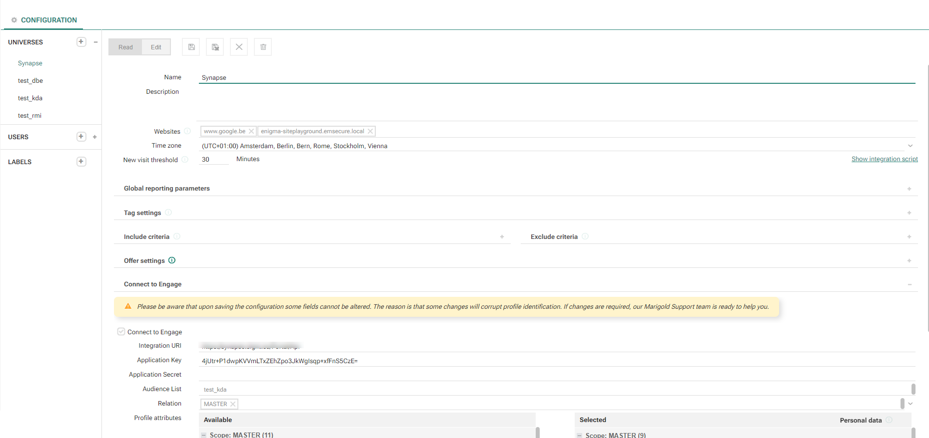 Note: The universe name in Site has to be exactly the same as the Business unit name in Selligent by Zeta, in order to set up a connection!