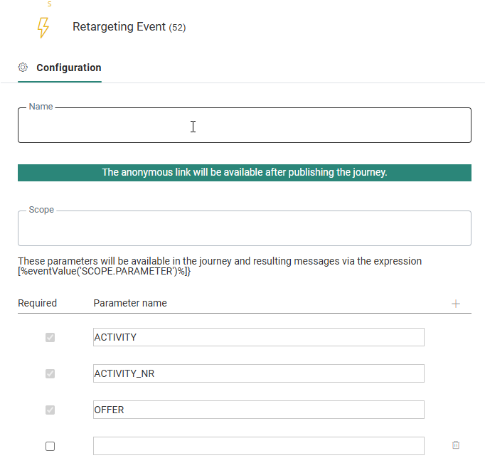 Always give your retargeting journeys and event parameters easily recognizable, descriptive names. They are used in Site’s offer settings.