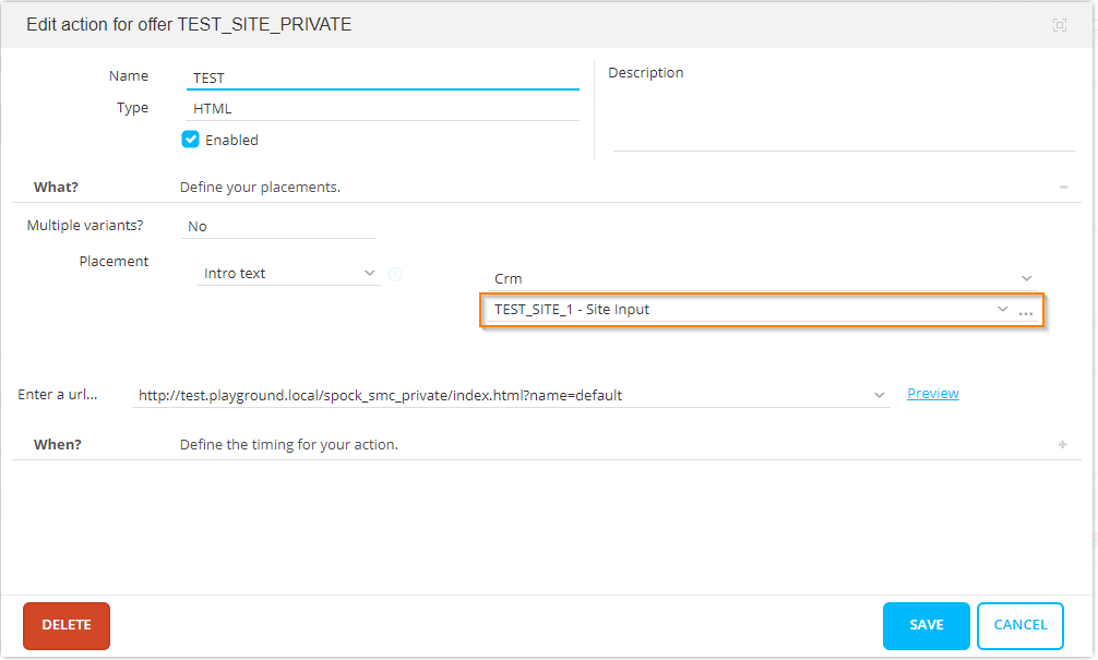 When creating an offer action, it is possible to select any of the published Selligent targeting journeys from the CRM drop-down list in the Placement section.