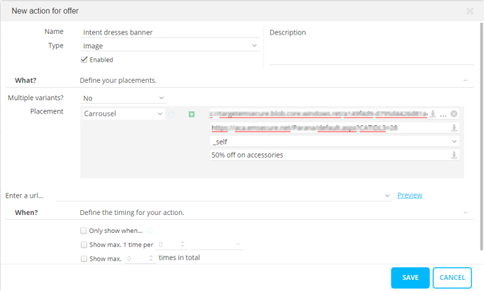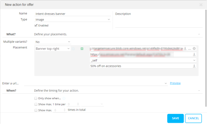 - Activity "Clicked discount". This is the dresses web page url. This url will also be used in as the click url for the banner content we will define in the next step. If someone clicks the banner, Site will have a hit on this offer, and the activity is measured.