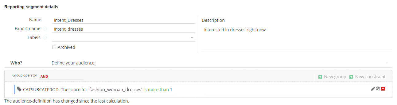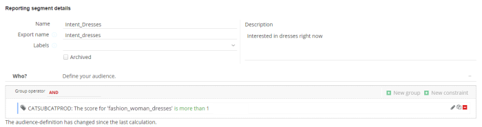 Create a new reporting segment "Intent dresses". The audience checks if the visitor visited the "Dresses" section at least twice. Thus, the value "fashion_women_dresses" for our tag "Site category hits" must have been passed at least twice during the visitor's current web session.