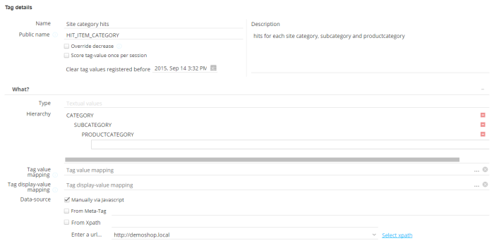 Create a tag "Site category hits". We will collect textual values and data for all 3 category levels will be collected: the main category, subcategory and the product category. E.g. Fashion, women, dresses. Data for this tag will be pushed back from the web pages. For the dresses page, this will be "fashion_women_dresses".