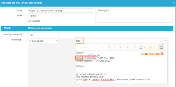 The Journey is used as content for the popin. The first Journey page "loyalty card benefits" is displayed first. When the visitor clicks the "see more" link on the Journey page we want to mark this as a hit on the offer. In a popin or popup, we need to pass an offer hit to Site with JavaScript. This is because the content of a popin or popup is loaded as a separate page in an iframe.