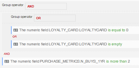 Whether the customer has a loyalty card or not, is retrieved from the field LOYALTYCARD on the LOYALTY_CARD profile extensions, again linked to the audience list selected in the universe settings. This field must be empty or zero.