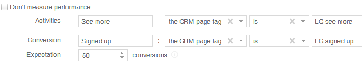 Here you define objectives for the offer: when is someone converted and which steps (activities) you want to measure in between. The activity and conversion come from the CRM content displayed in the popin (the offer action).