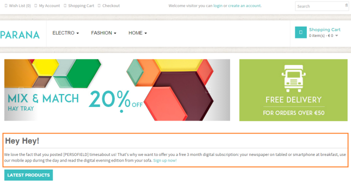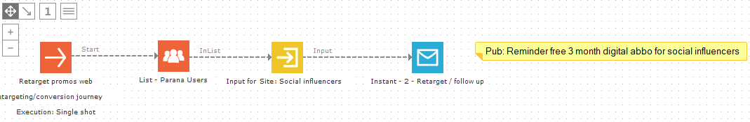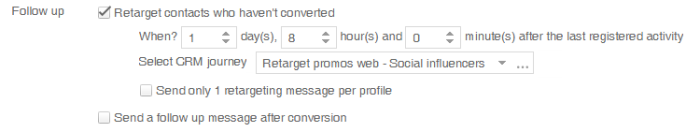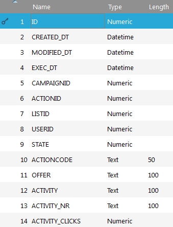 Since we have defined an activity, we can retarget the CRM identified (Campaign) contacts with an email if they do not accept the offer within 2 days. To send a retargeting email we need to use an action list in Campaign. How to create this is extensively discussed under Setup in Campaign, Targeting and retargeting. Basically, you need an action list with fields to store the OFFER name, ACTIVITY name and number, and any custom field you want. You can use this field to store data from Site in the action list. We will store the number of clicks the contact has done on the activity "clicked discount". We could use this info in the retargeting email or use it for data analysis later on.