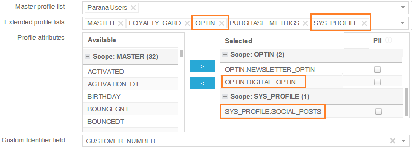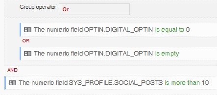 - Profiles that do not have a digital subscription yet. This is also stored in a profile extension OPTIN linked to the audience list. The field OPTIN.DIGITAL_OPTIN is selected in the universe settings and must be empty or zero