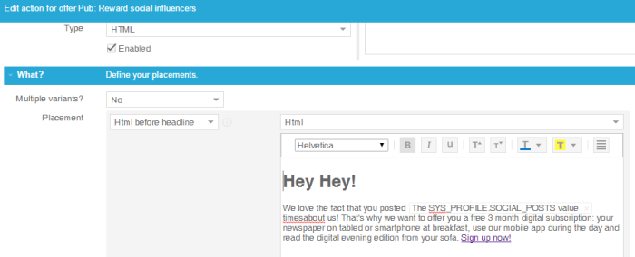 Here you define objectives for the offer: when is someone converted and which steps (activities) you want to measure in between. After the visitor clicks the link in the offer content (html) the visitor goes to the digital subscribe page. The click counts as a hit on the offer and we can measure activities and a conversion. The digital subscribe confirmation page returns the conversion for the offer.