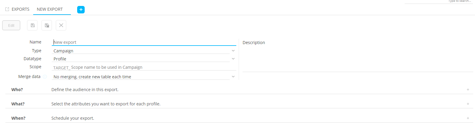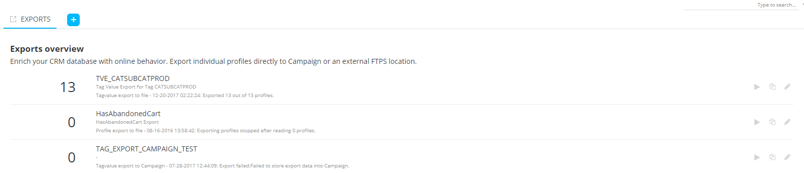- Type — Two types of export can be created: Campaign or file.