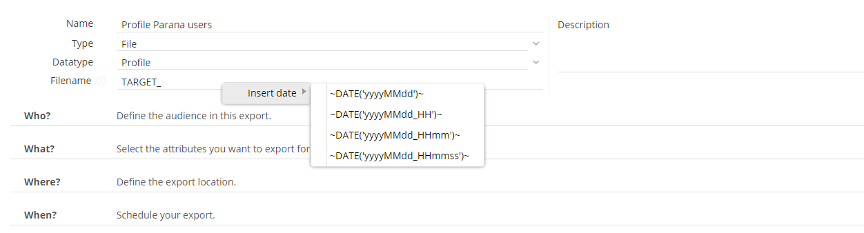 In case of a file export, you can enter the file name freely. It is possible to use for instance a date function in the file. A right click in the field gives access to the option 'Insert Date' and allows using the DATE function. The user can decide on the format to use for the date.