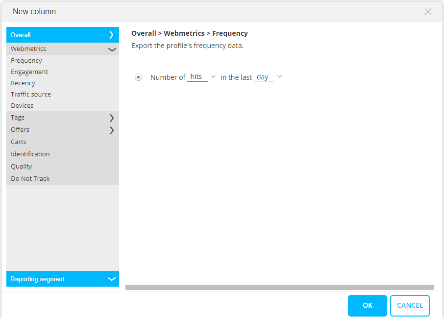 This 'New Column' dialog contains two entries: overall (profile information) and Reporting segments.