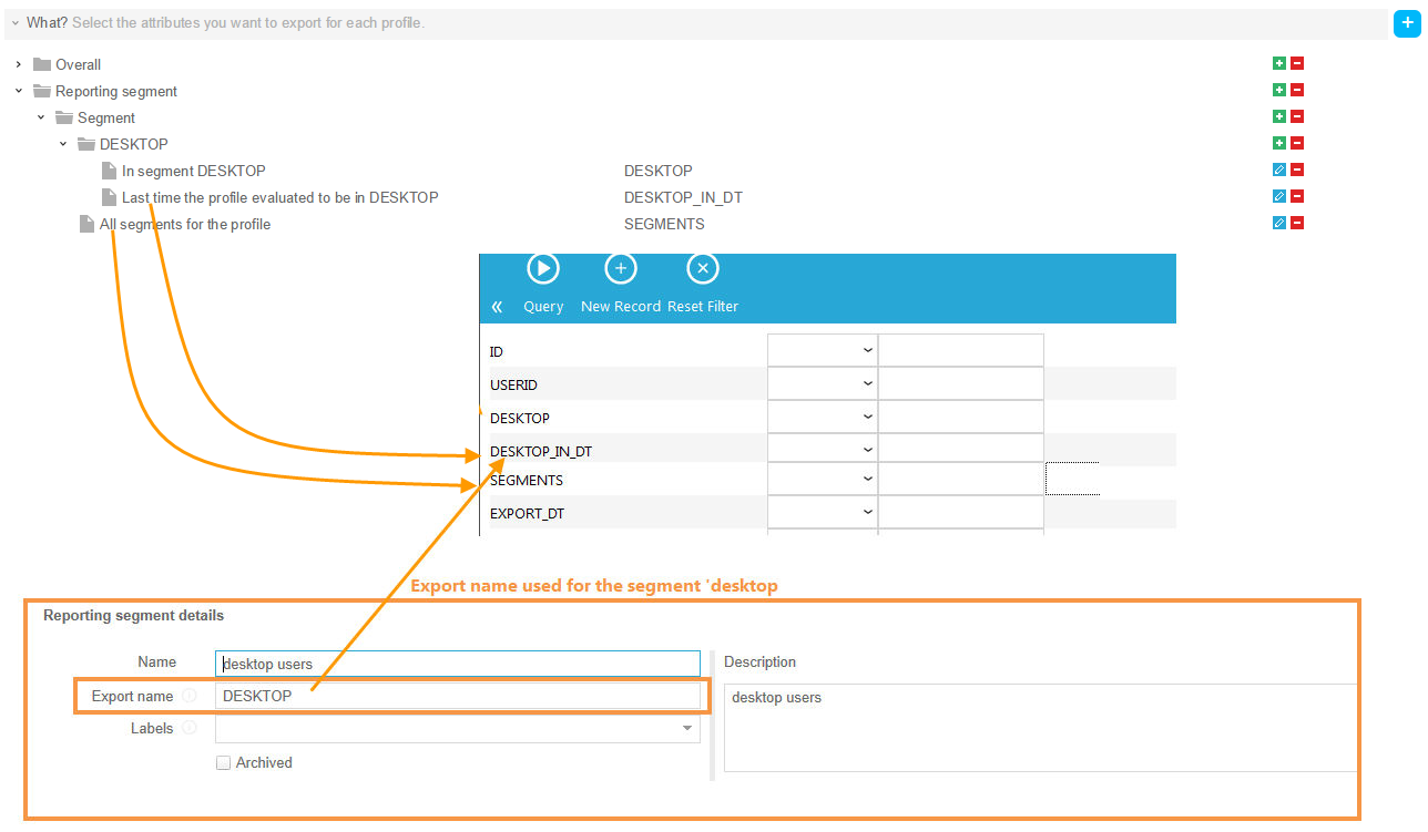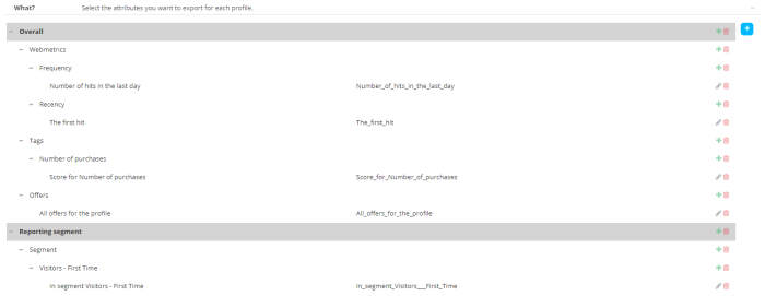Reporting segment — Existing Reporting segments can be used in the definition of export. Is the profile in a specific segment, when was it last time in this segment, when did it no longer belong to the segment. All segments for the profile can be exported as well.