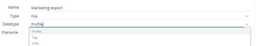 - Data type — Profile, tag or offer can be selected.Offer can only be selected when type is set to File.