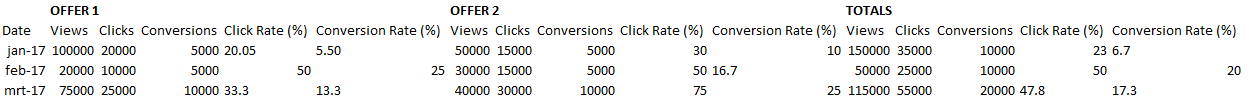 - The name, number of views, clicks, conversions, click rate (%) and conversion rate (%) per offer.
