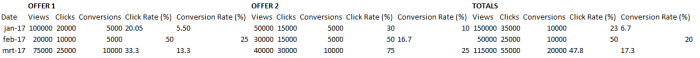 - Totals representing the sum of all views, clicks, conversions, click rates (%) and conversion rates (%) for all exported offers.