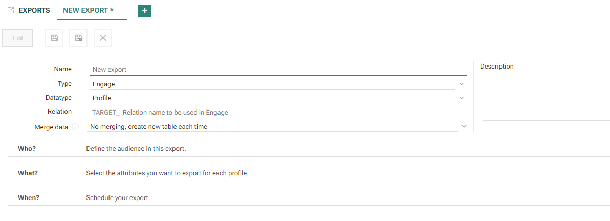 In case Offer is selected, (a selection of) all active offers over a certain timeframe are exported. - Relation — In case of a Selligent export this field defines the name of the relation that needs to be created and linked to the audience list. Per export one relation is created. The relation name for a Selligent export always starts with 'TARGET_'.