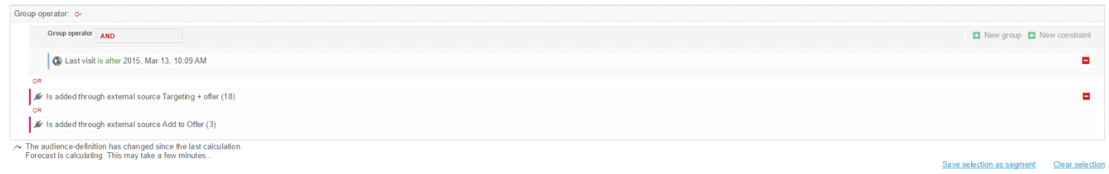 Define your offer audience using the constraint editor. Link constraints using the operators And, Or, AndNot, OrNot. Create groups to group conditions together. When no audience is defined, the offer is triggered for every profile.