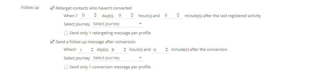 • Send a follow-up message after conversion: sends a Selligent Journey message after the visitor converts.