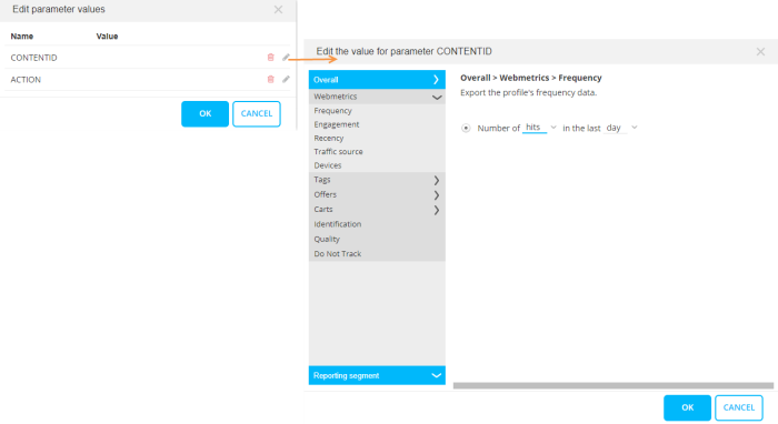 Use the ... button to the right of the field to set the values for the Journey’s custom input parameters. Click the ‘Edit’ icon to the right of the custom parameter to select the value. A dialog is displayed where a choice can be made between profile data (hits, visits, visit durations…), tag values (Site tag values) and offer data (if the user visitor is in and offer or not, and when he was in or out of the offer). Identification data, Do not Track option and Reporting segments can equally be used to set the values for the parameters.. (More details in Define Actions topic.)